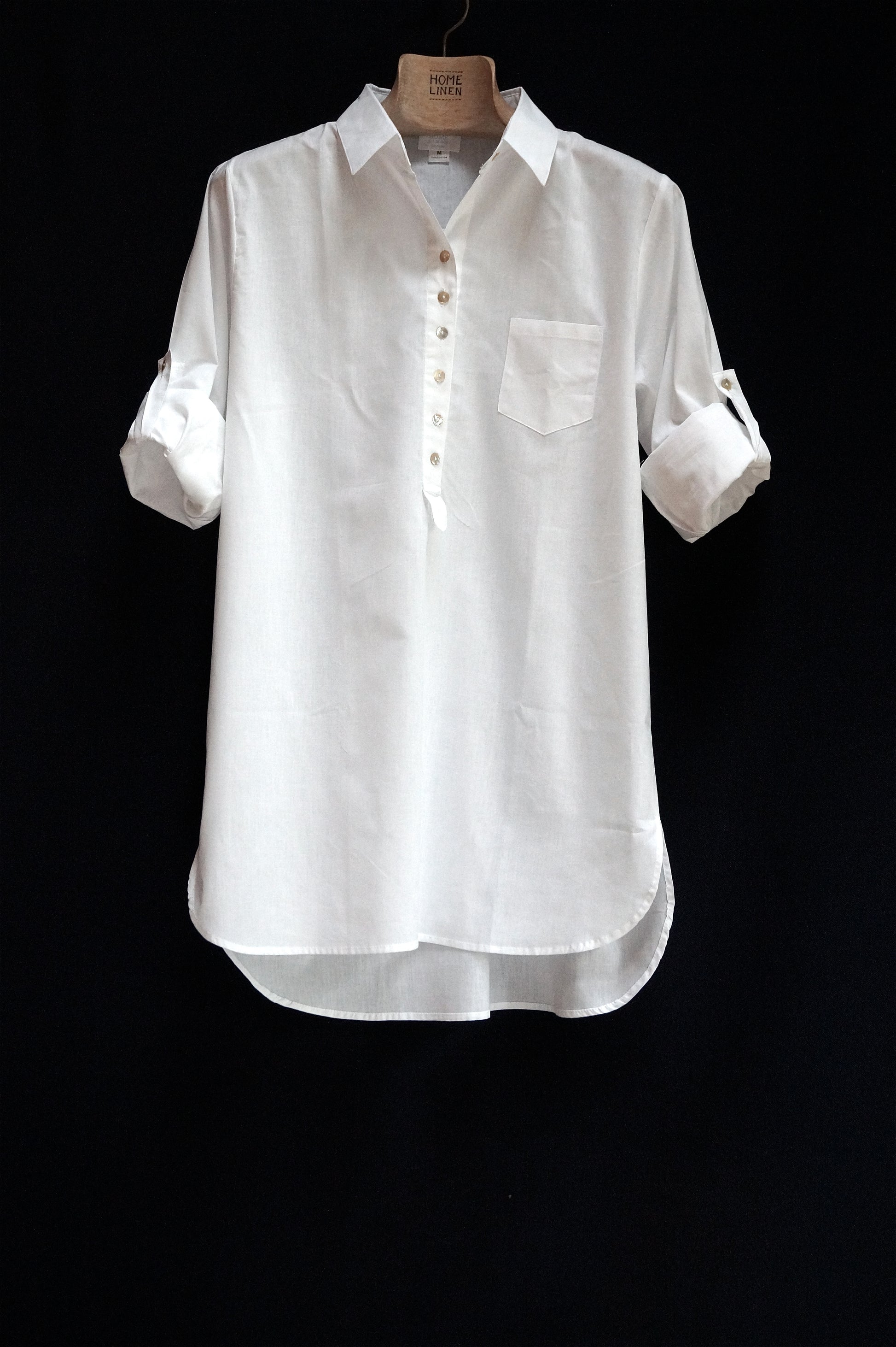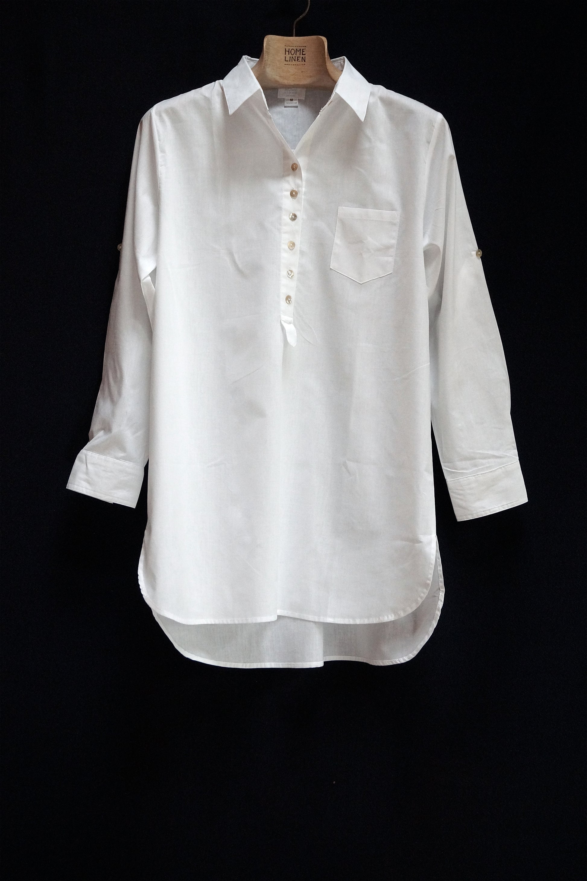 White, kneelenght nightshirt with long roll up sleeves in fine cotton. It is inspired by 19th century mens shirt.